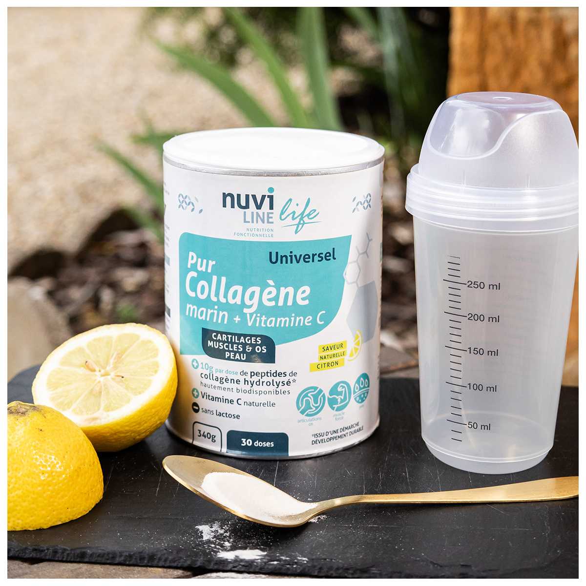 INGREDIENTS : collagène hydrolysé de poisson (92%), arôme naturel de citron et autres arômes naturels, poudre de jus d'acérola (Malpighia glabra) titrée en vitamine C*, anti-agglomérant : carbonate de magnésium.