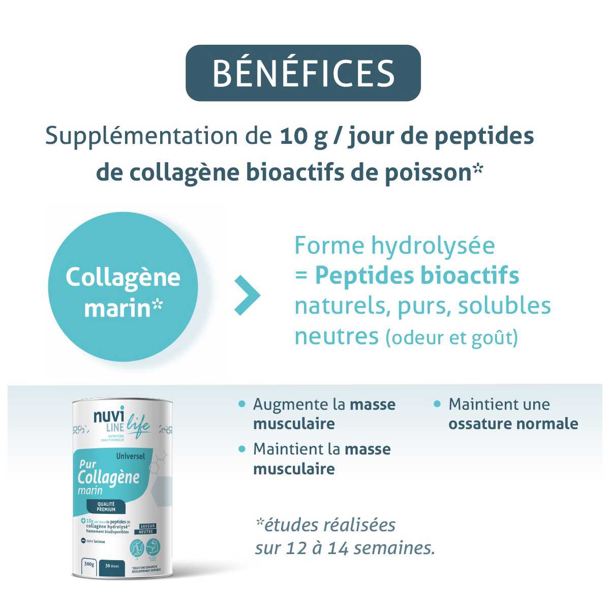 - ARTICULATIONS : des études ont notamment montré sur 12 semaines (3 mois) l'intérêt d'une supplémentation avec notre collagène marin pour soulager les symptômes de l'arthrose du genou, symptômes tels que la douleur et la capacité ou fonction physique. Une amélioration corrélée de la qualité de vie a été observée. Cette étude a ainsi permis de démontrer le rôle du collagène pour la santé des articulations.