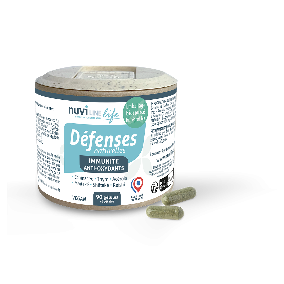 INGRÉDIENTS : Echinacée (Echinacea purpurea L.), Thym (Thymus vulgaris L.), Acérola extrait 25% (Malpighia punicifolia L.), Maïtaké (Grifola frondosa Gray), Shiitaké (Lentinula edodes), Reishi (Ganoderma lucidum P. Karst.). Enveloppe végétale (HydroxyPropylMéthylCellulose).