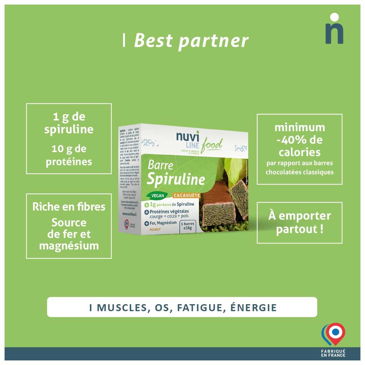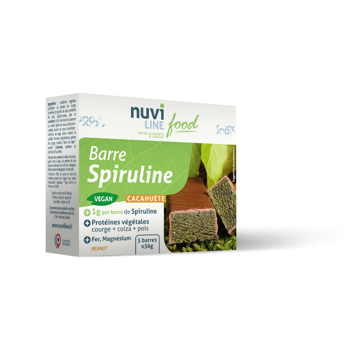 INGREDIENTS : protéines végétales (protéines de graines de courge, protéines de graines de colza, protéines de pois), oligofructoses, pâte de cacahuète 10%, chocolat de couverture au maltitol (pâte de cacao, édulcorant : maltitol, beurre de cacao, émulsifiant : lécithine de soja, arôme naturel de vanille), fructose, polydextrose, graines de courge toastées, fibres de soja**, poudre d'amandes, paillettes de spiruline 3%, arôme.