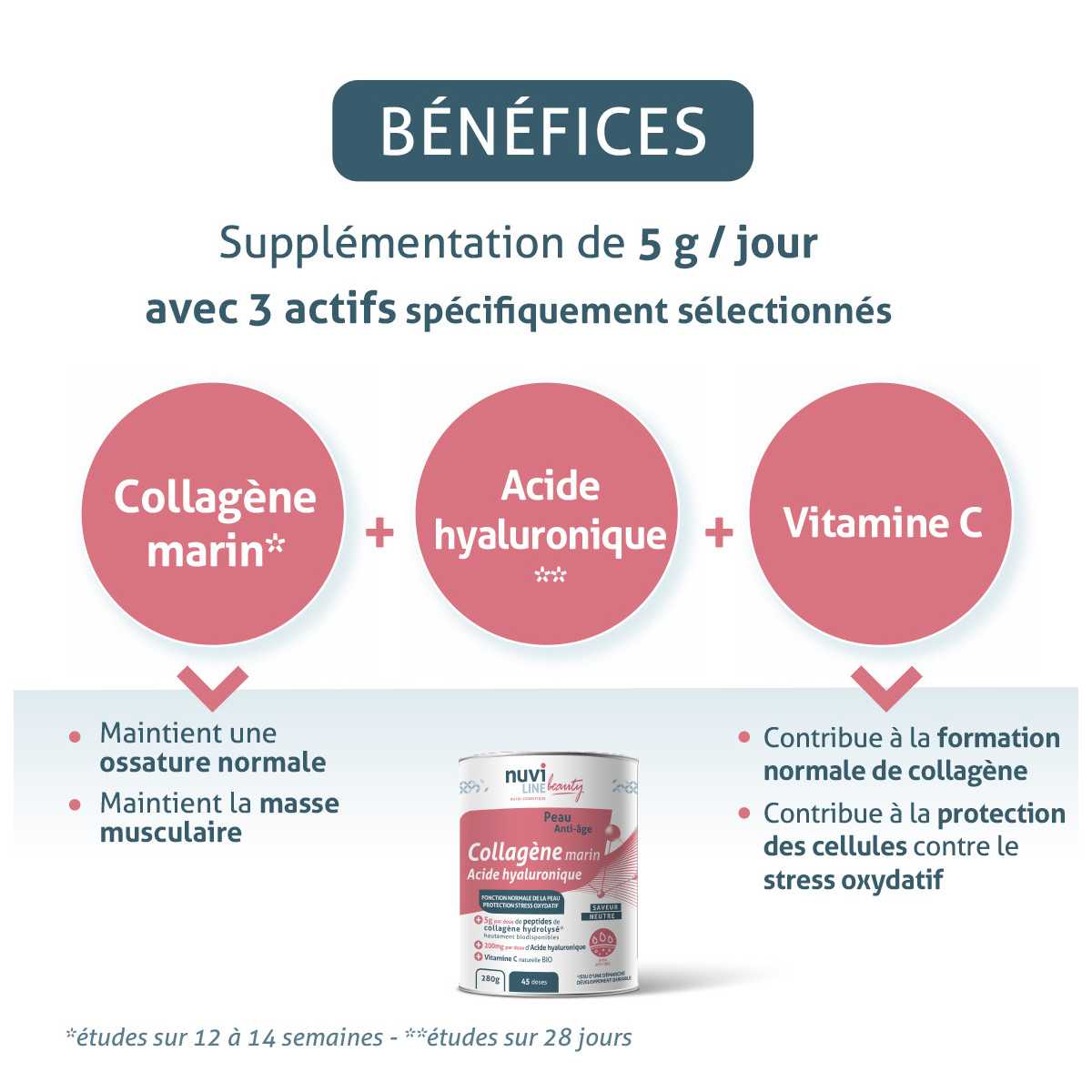 INGREDIENTS : collagène de type 1 hydrolysé issu de poisson (88%), poudre de jus d'acérola (Malpighia glabra) titrée en vitamine C bio*, hyaluronate de sodium (3,3%) titré en acide hyaluronique, anti-agglomérant : carbonate de magnésium.